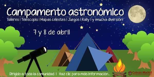 Campamento astronómico. Escrito por Madrid en 29 marzo, 2017. Deja un comentario Extensión Educativa invita a toda la comunidad al Campamento astronómico, el 7 y 8 de abril en las instalaciones del colegio. Compártenos Anterior Siguiente