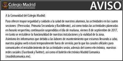 Suspensión de labores el 8 de septiembre Escrito por Madrid en 7 septiembre, 2017. Deja un comentario Continúa la suspensión de labores el 8 de septiembre. Compártenos Anterior Siguiente
