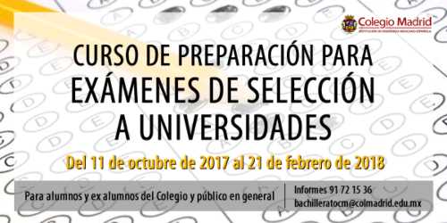Abierto a alumnos, ex alumnos y público en general, el Curso de preparación para exámenes de selección a universidades, se llevará a cabo en las instalaciones del Colegio Madrid del 11 de octubre de 2017 al 21 de febrero de 2018.