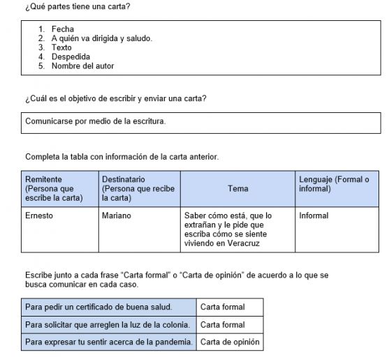 Uno de los aprendizajes esperados de español en 6º grado, es que los alumnos identifiquen la estructura de las cartas de opinión y analicen su información; por lo que a principios del mes de mayo comenzaron por reconocer la importancia que tienen las cartas para comunicarse con los demás, distinguiendo sus características, partes y funciones, por medio de diversas actividades, por ejemplo: identificar las ideas principales dentro de los textos, resolver cuestionarios, llevar a cabo lecturas, redactar cartas y completar información de tablas.