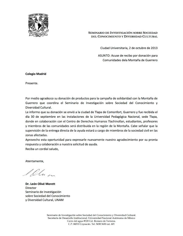 Les compartimos la carta agradecimiento que el SEMINARIO DE INVESTIGACIÓN SOBRE SOCIEDAD DEL CONOCIMIENTO Y DIVERSIDAD CULTURAL envía al Colegio Madrid por su colaboración en el acopio realizado en beneficio de los afectados en la Montaña de Guerrero por las pasadas lluvias del mes de septiembre.