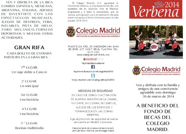 Programa de la Verbena 2014 Escrito por Madrid en 14 marzo, 2014. 1 Comentario Los invitamos a consultar el programa de la Verbena 2014. ¡Los esperamos el próximo domingo 30 de marzo! Para ampliar el programa, favor de hacer clic en las imágenes. Compártenos Anterior Siguiente