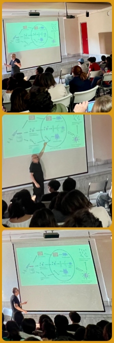Con un lenguaje claro y apasionado, el investigador del departamento de microbiología de la ENCB-IPN transportó a los y las estudiantes a un mundo microscópico resaltando el impacto que este su día a día: desde las bacterias que pueden enfermarnos hasta los virus y vacunas que se han desarrollado en los últimos años cambiando las expectativas de vida.