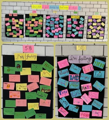 ¡De regreso en mi Colegio! En la clase de inglés las y los alumnos de quinto grado de primaria realizaron una actividad, en la cual pensaron y analizaron sus sentimientos más representativos de la primera semana de clases. Para ello, debieron considerar varios factores: el volver a ver a sus amigos y amigas, el ya no poder levantarse tarde en las mañanas, el comenzar con sus responsabilidades de estudiar y hacer tareas, en resumen, el volver a sus rutinas de estudio. La parte crucial fue que tuvieron que elegir una sola palabra de una larga lista. Y que esa palabra describiera el sentir que mayormente predominó en ellos y ellas, durante esos cinco primeros días del ciclo escolar 2025-2026. Finalmente, realizaron un poster por grupo, en el que cada alumno y alumna pegó la palabra que definía su sentir. Fue muy gratificante ver que a pesar de que algunos y algunas alumnas mencionaban querer más vacaciones, el sentimiento que predominó fue que estaban muy felices de estar de vuelta en su colegio. 5° año de primaria