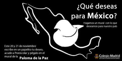 ¿Qué deseas para México? Escrito por Madrid en 19 noviembre, 2014. Deja un comentario Hagamos un mural con lo que deseamos para nuestro país. Compártenos Anterior Siguiente