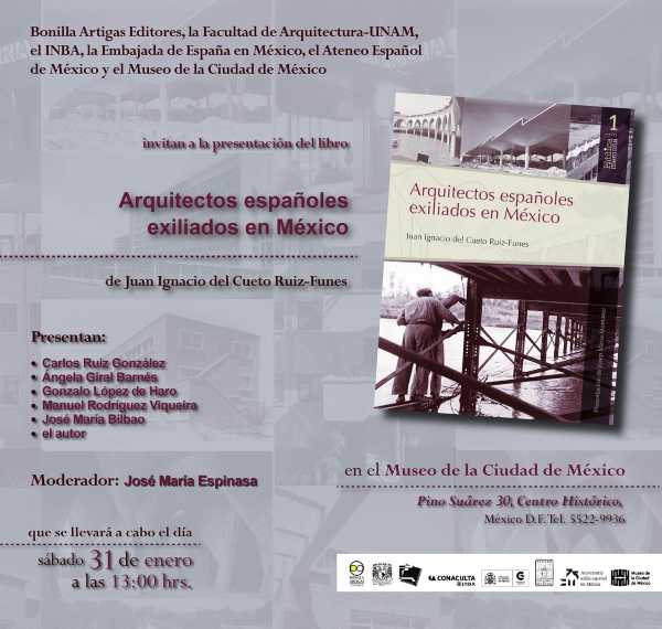 Les invitamos a la presentación del libro «Arquitectos españoles exiliados en México» de Juan Ignacio del Cueto Ruiz-Funes, miembro de la Asamblea de Asociados y Junta de Gobierno del Colegio Madrid. Se llevará a cabo en el Museo de la Ciudad de México el sábado 31 de enero a las 13:00 hrs.