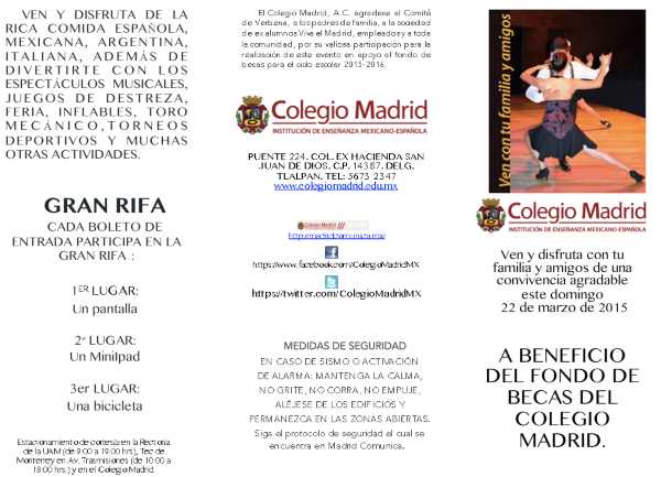 Programa Verbena 2015 Escrito por Madrid en 12 marzo, 2015. Deja un comentario Los invitamos a consultar el programa de la Verbena 2015. ¡Los esperamos el próximo domingo 22 de marzo! Para ampliar el programa, favor de hacer clic en las imágenes. Compártenos Anterior Siguiente