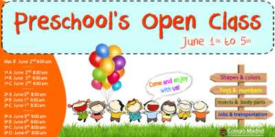 Preschool´s open class Escrito por Madrid en 25 mayo, 2015. Deja un comentario All parents are invited to Preschool´s open class from June 1st to the 5th. Compártenos Anterior Siguiente