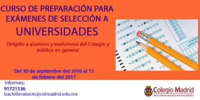 Abierto a alumnos, ex alumnos y público en general, el Curso de preparación para exámenes de selección a universidades, se llevará a cabo en las instalaciones del Colegio Madrid del 30 de septiembre de 2016 al 15 de febrero de 2017.